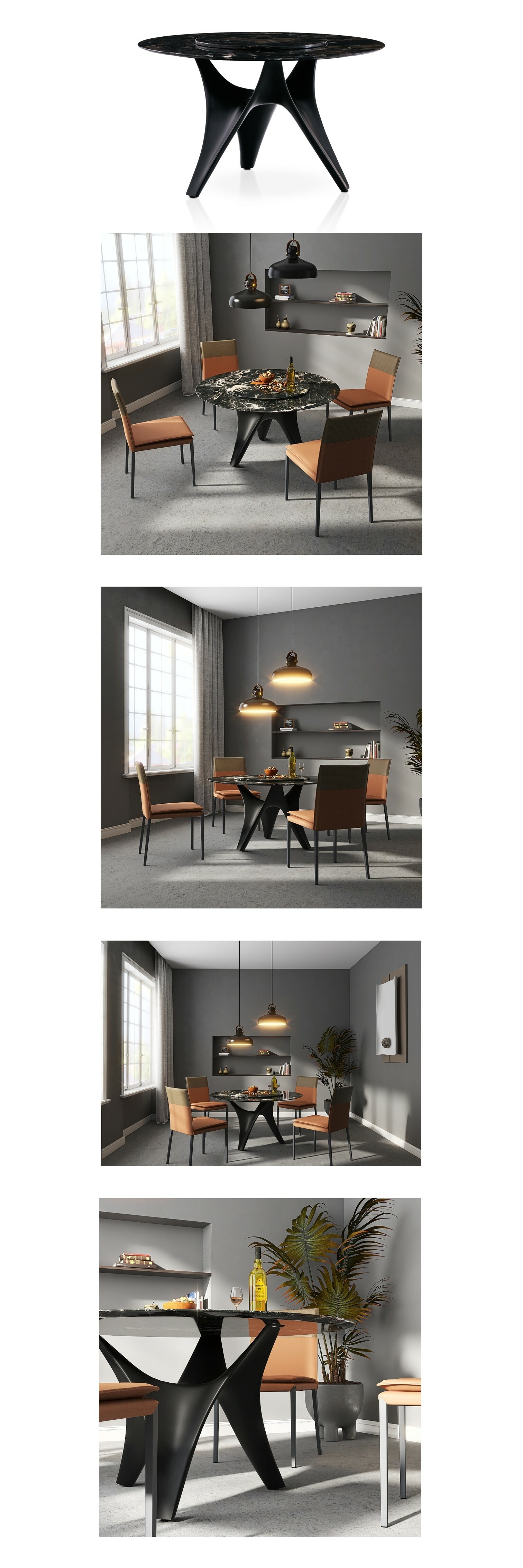 黑色天然石桌面紋理獨特,如流水般蜿蜒流淌,搭配雕塑感十足的金屬桌腳,營造出優雅且充滿張力的視覺效果。