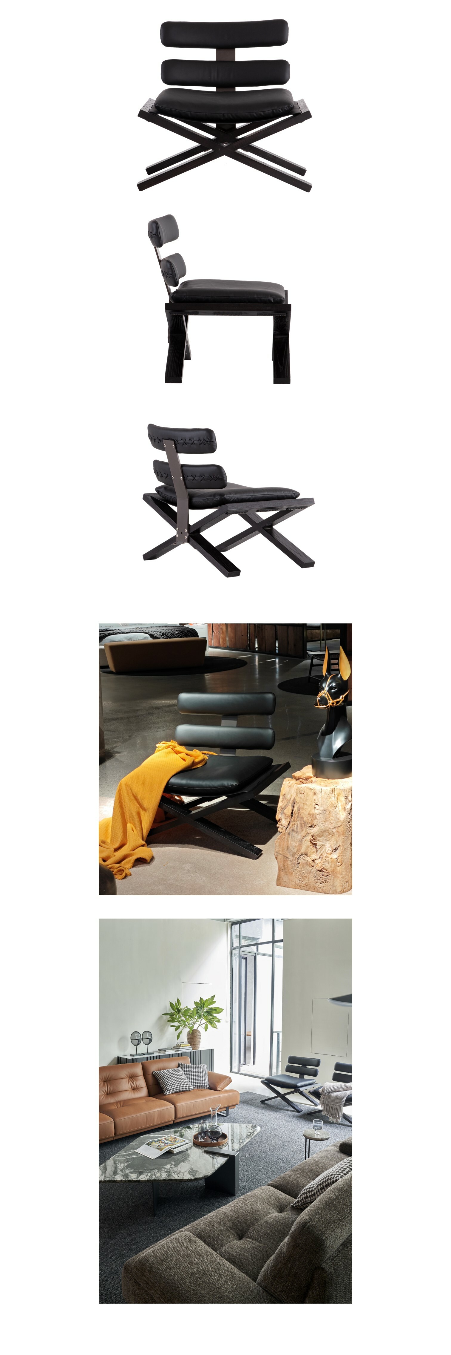 以層疊設計展現沉穩之美,柔軟的皮革坐墊搭配交錯木質結構,剛柔並濟,簡約而有力。