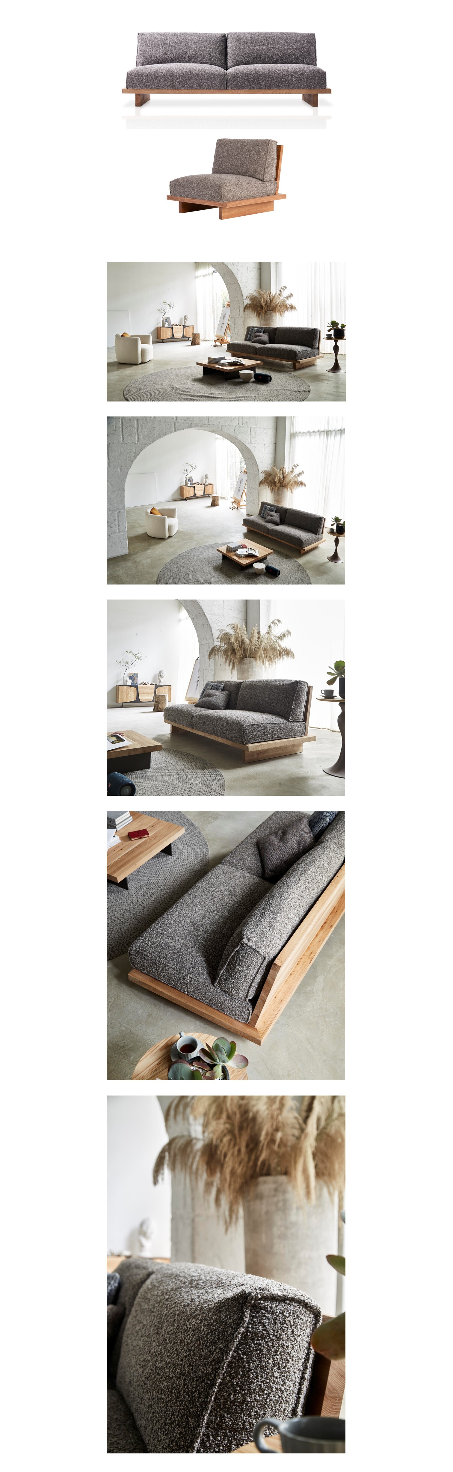 以東方居所的內斂氣韻為靈感,Hanlu 沙發以低矮的木質基座搭配素雅灰調,呈現出如同靜謐廬舍般的安然氛圍。