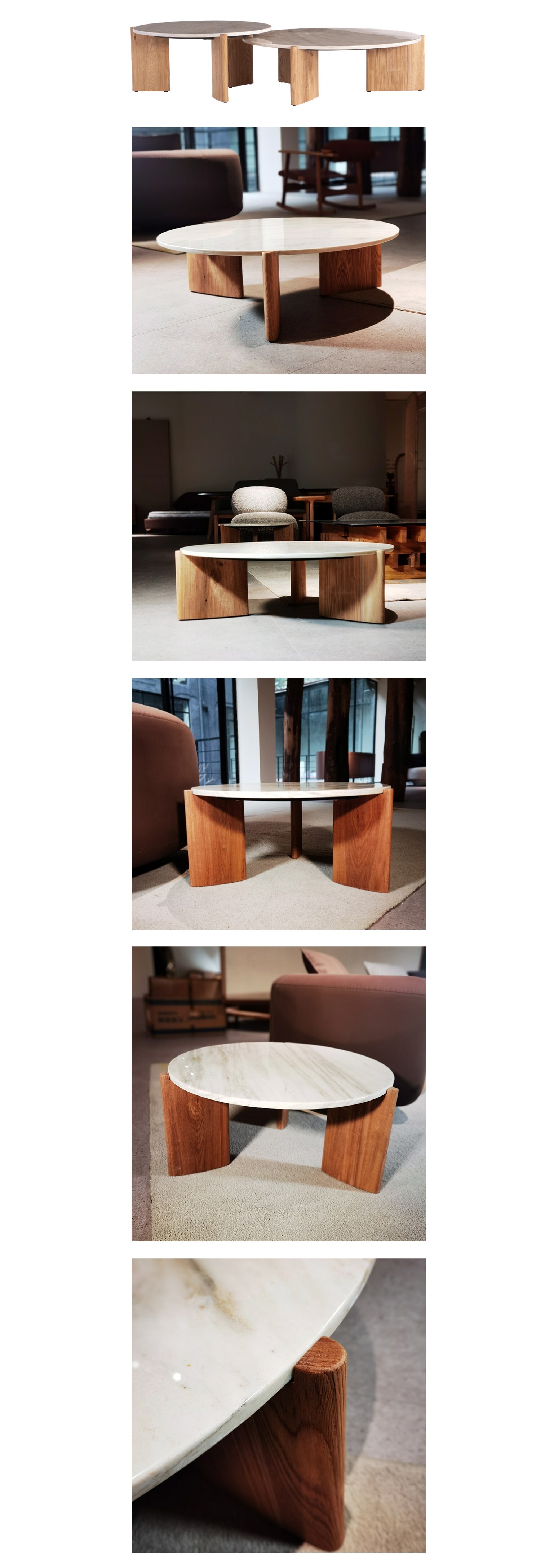 桌面選用天然石材,自然紋理如海面映光;而支撐其下的弧形木腳,則如同被潮水浸潤後的礁石,溫潤而堅實。