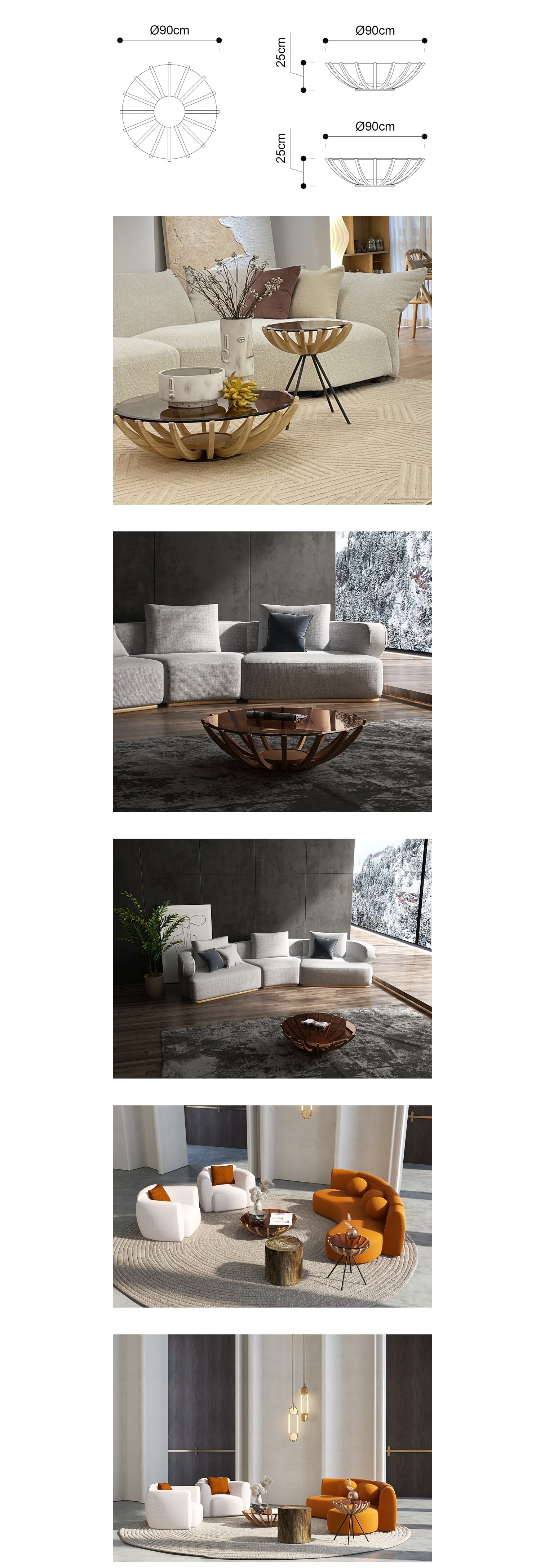 主茶几如盛開的器皿,以層疊的托盤結構營造出彷彿盛裝光影與時間的空間中心;
