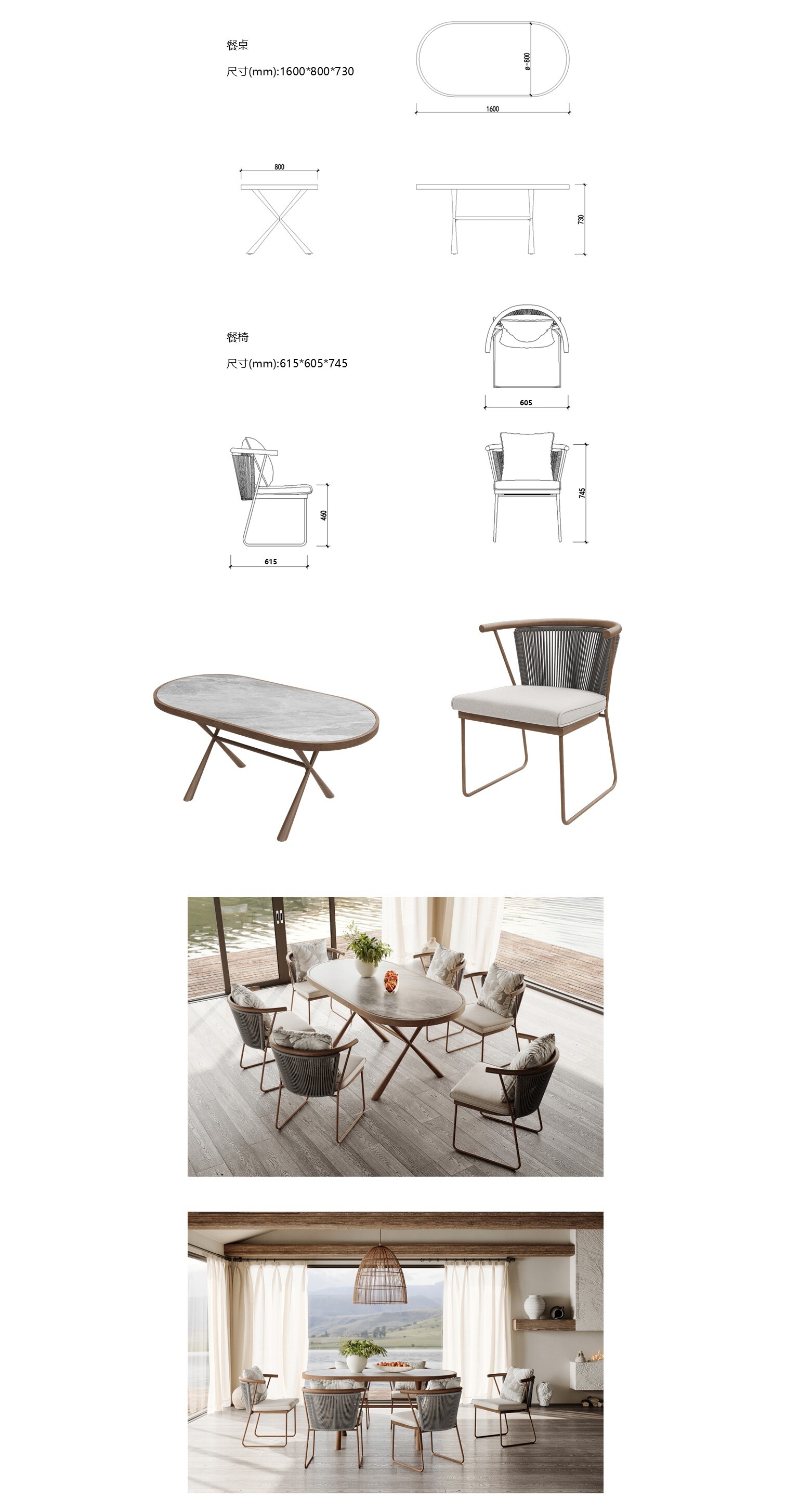 尺寸(mm):餐桌:1600*800*730/餐椅:615*605*745