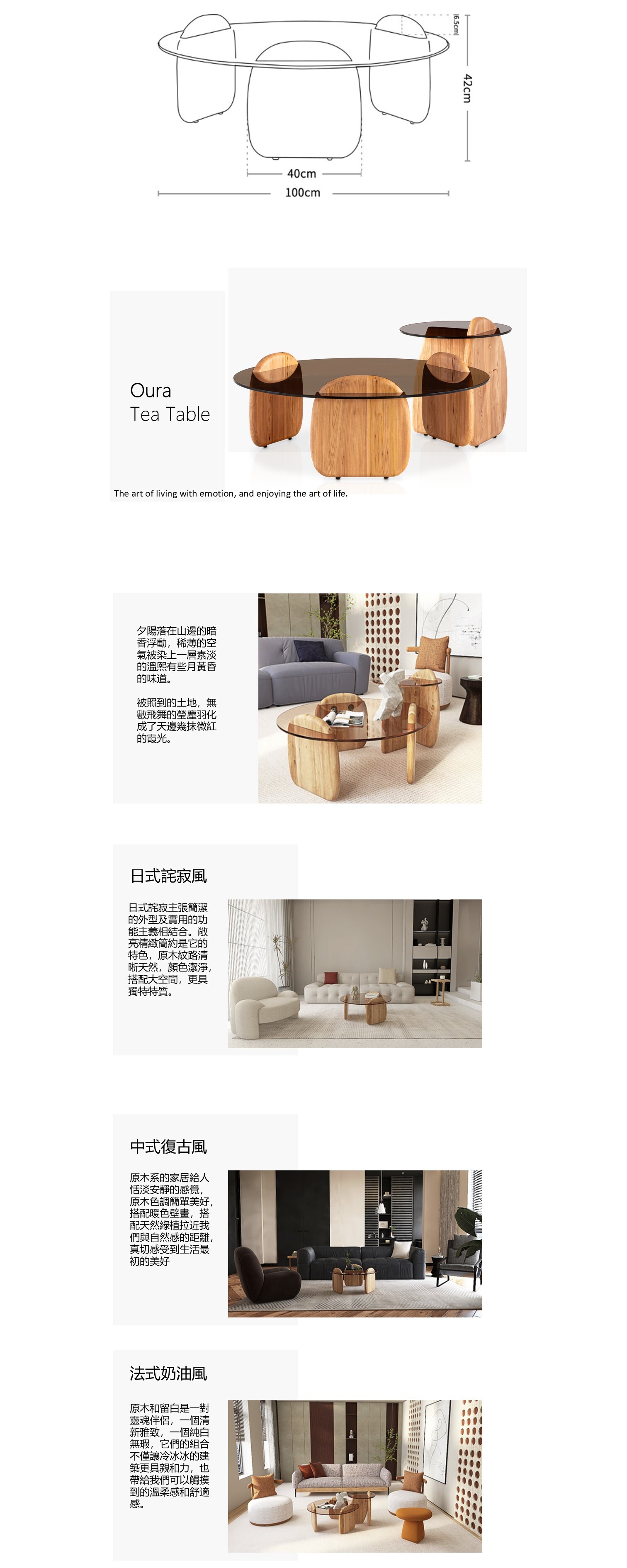 Oura 茶几以圓潤厚實的木質結構托起一片茶色玻璃,如湖面映照夜空,靜謐且富有層次。