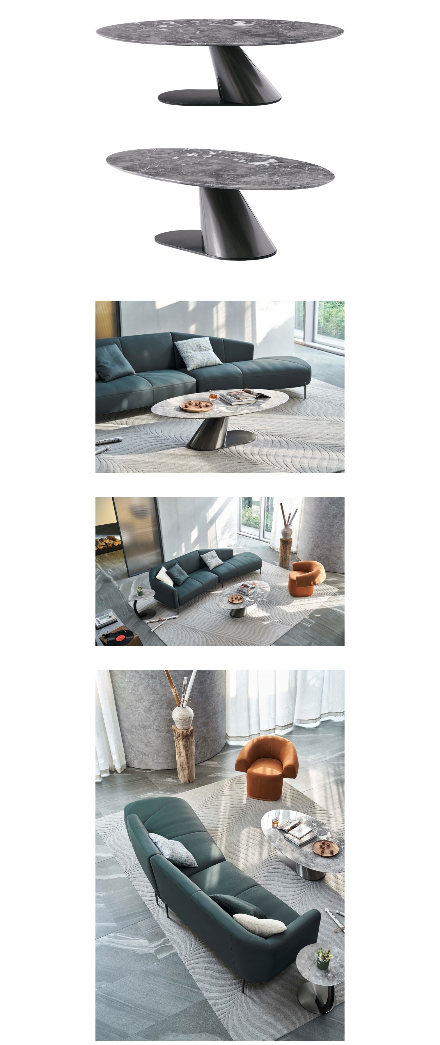 桌面呈現優雅的橢圓形輪廓,搭配非對稱傾斜底座,彷彿石板懸浮於空間之中,在輕盈與穩定之間達到完美平衡。