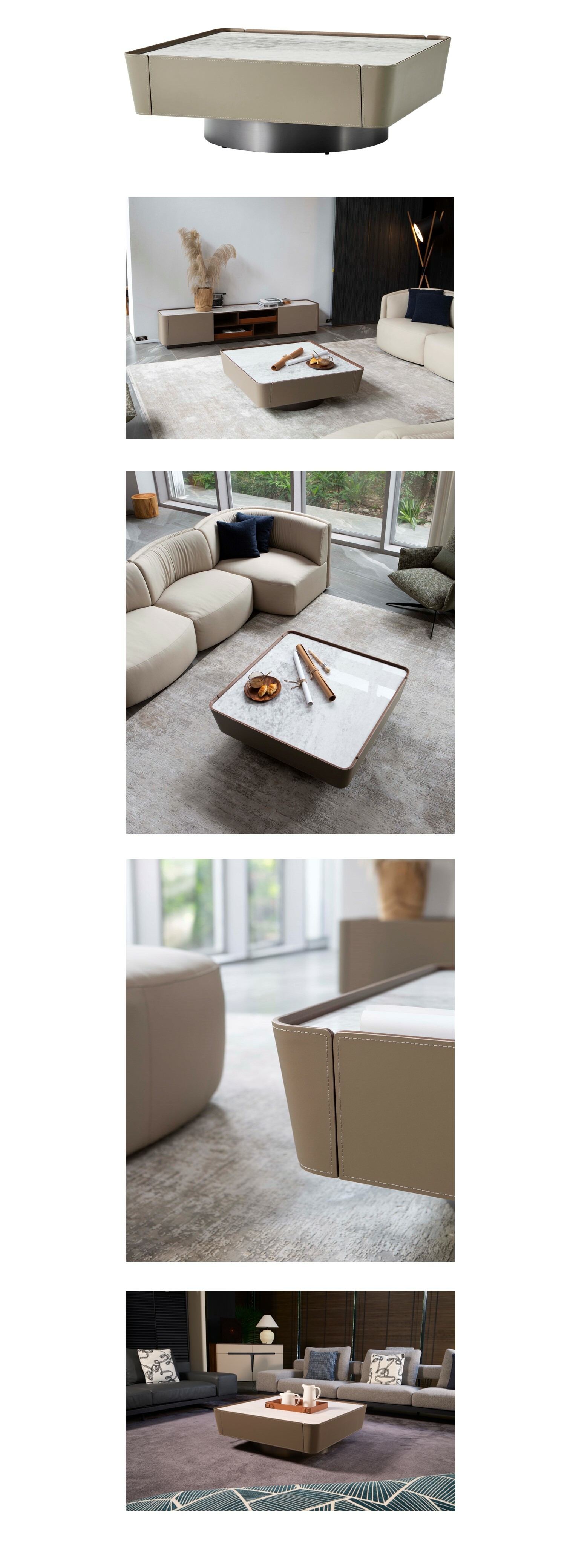 精緻的皮革包覆桌體,搭配拋光金屬底座,營造出懸浮般的視覺效果,為空間增添奢華與格調。