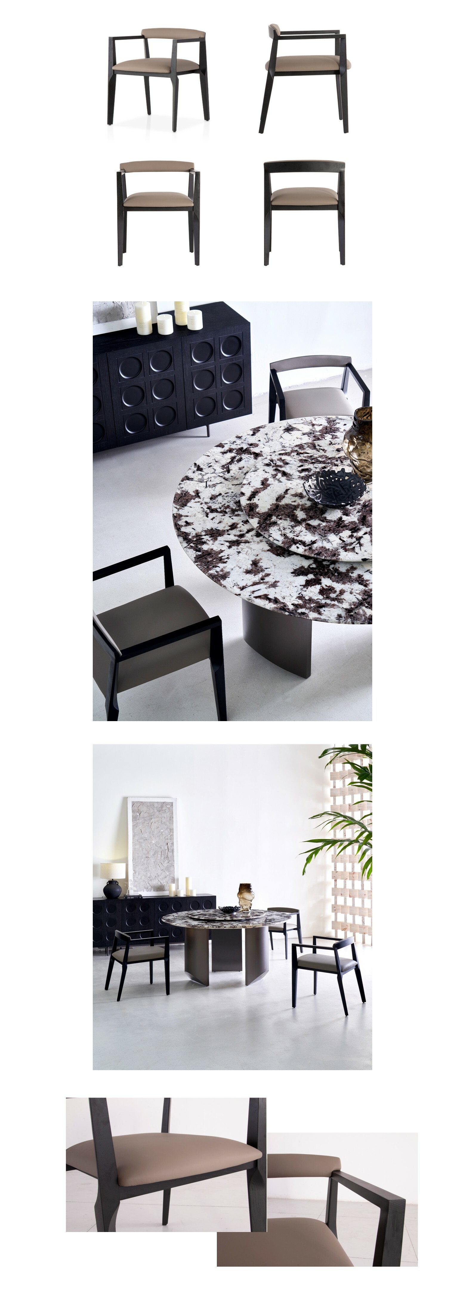 實木椅身搭配柔軟皮革坐墊,兼具自然溫潤與舒適體驗,椅背設計簡潔有力,提供適當支撐之餘,讓空間視覺更顯開闊。