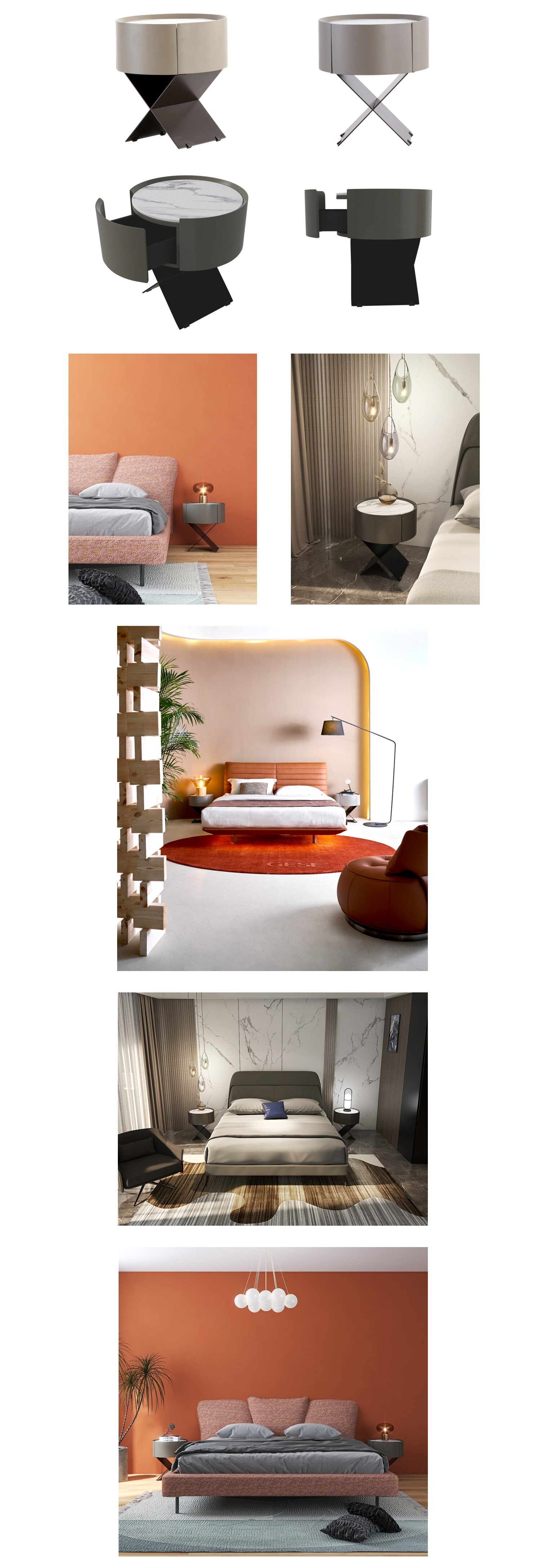 X 型金屬底座穩固而富有張力,與上方柔和霧面的圓形櫃體形成視覺對比,簡約卻不失層次。